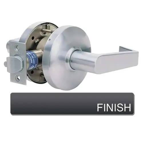 Outside knob/lever locked by pushbutton on inside knob/lever. Rotating inside knob/lever or closing door releases/unlocks button. Emergency release in outside knob/lever.