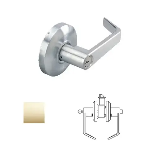 Outside knob/lever locked by pushbutton on inside knob/lever. Rotating inside knob/lever or closing door releases/unlocks button. Emergency release in outside knob/lever.