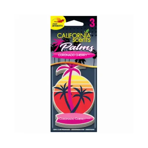 California Scents, 3 Pack, Palms Paper Coronado Cherry Air Freshener. Cherry-scented car freshener in a hanging design adds a fruity fragrance to your space while the palm tree shape and bright colors add a decorative touch to your car.
