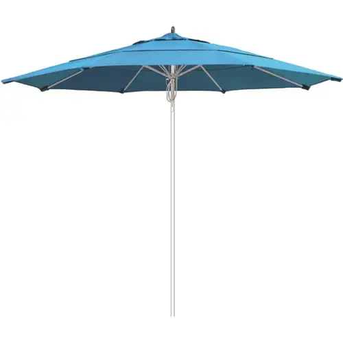 Clear summer days draw everyone out to enjoy the fresh air and temperate warmth, and you want to ensure your outdoor space has the best lounging and shaded areas around to entice more guests to visit your patio haven. With the 11 ft. Commercial Grade Aluminum Double Pulley Market Patio Umbrella as your centerpiece, your outdoor space will immediately become the focal point of the afternoon. The durable double pulley-lift allows for easy opening and closing of the umbrella whenever the sun's harmful rays brighten your space. Beneath the spacious solution-dyed Sunbrella canopy's long-lasting shade barrier, you can relax and take shelter from the burning sunlight without concern over fading or rot due to the 5-year manufacturer warranty. A sleek aluminum center pole stabilizes the umbrella, its heavy-duty, thick walls providing extra durability to increase the longevity of your patio shade fixture. Each rib on this umbrella is also constructed of premium fiberglass that conveniently bends and flexes in the wind, improving the wind resistance on days when the breeze becomes more violent. A picturesque sunny day is bright and cheerful, and this commercial-grade patio centerpiece is the perfect accessory to make your enjoyment of comfortable and safe, so add this umbrella to your patio to make it a stylish oasis that you and your guests will gravitate to.