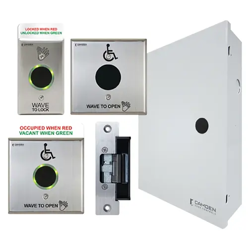 Touchless Switch Restroom Kit, (1) CX-33PS (60-40E035) Advanced Logic Control Relay & Power Supply Cabinet, (1) CM-331/43S-SGLR Wired Touchless Switch, (1) CM-331/42SW-SGLR Wired Touchless Switch, (1) CM-325/42SW Wired "Short Range" Touchless Switch, (1) CX-ED2079 'Universal' Electric Strike, (1) CX-MDA Magnetic Contact
