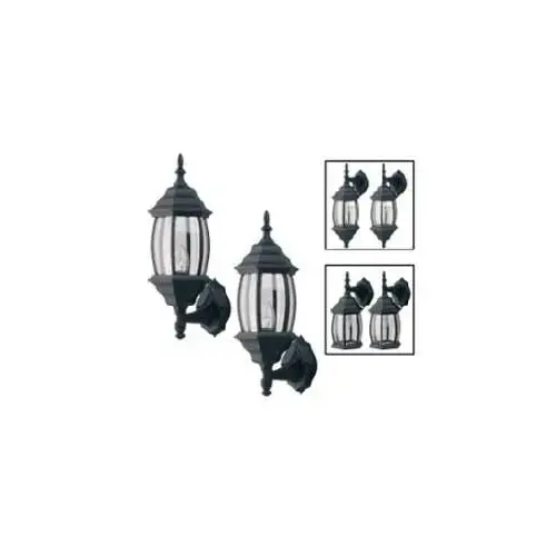 Clear beveled glass panels. Mounts as downlight, uplight or downlight open. Uses 1 x 100 W A style bulb (not included). 8 in extension from wall. 7 in W x 17 in H. cCSAus.