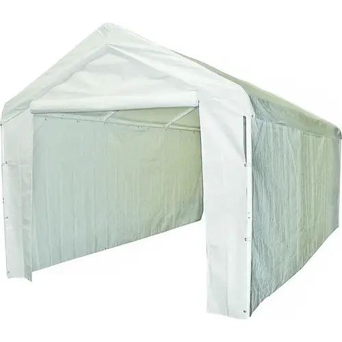 Caravan Canopy Sidewall/Enclosure Kit helps to keep your belongings safe and secure. Dimensions: 9.6 ft Interior Peak Height, 6 ft Exterior Height , 10 ft Exterior Width, 20 ft Exterior Depth, Foundation Length: 20 ft, Foundation Width: 10 ft. Rectangle shape, polyethylene, white color. Includes sidewall x 2/front and back wall. Use with portable carport Sku #129.6029.