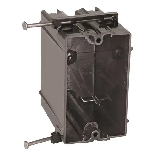 Single-Gang Nail-On Outlet Box, Volume 20.3 cu. in. Rugged polycarbonate construction to withstand extreme temperatures. Box will not distort or soften in heat and they do not become brittle in the cold.