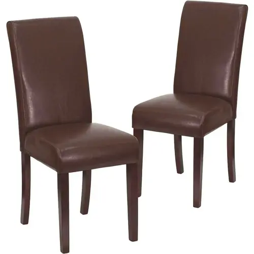 The classic design of this brown LeatherSoft upholstered parsons chair makes it a versatile seating option for your home. Sleek lined panel stitching and a mahogany frame finish make them beautiful while high density foam padding and solid hardwood frame construction make them comfortable and durable. Parsons chairs are versatile and can be used not only in the dining room and kitchen but also as a reading chair or extra seating in the living room. The armless design gives the illusion of space which makes them great for small spaces. Make quick work of spills with a water based cleaner. Skirted chair covers can be used to soften their lines for living rooms and bedrooms. A parsons chair can be both formal or casual and are designed to go with almost any decor.