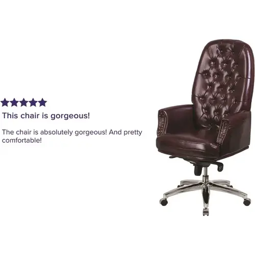 This burgundy, button tufted, LeatherSoft upholstered executive office chair combines old world craftsmanship with modern seating principles, giving you a chair that feels as good as it looks. Fully upholstered, padded arms with brass nail accents add a touch of sophisticated class. LeatherSoft is leather and polyurethane for added softness and durability. High back office chairs extend to the upper back for greater support. The high back design relieves tension in the lower back, preventing long term strain. The multi-tilt lock mechanism rocks/tilts and locks the chair in infinite positions while the tilt tension adjustment knob adjusts the chair's backward tilt resistance. The free rein motion is great for taking a quick break from typing to answer phone calls and relax. Chair easily swivels 360 degrees to get the maximum use of your workspace without strain. The pneumatic adjustment lever will allow you to easily adjust the seat to your desired height. The heavy duty chrome base and dual wheel casters add modern flair while giving you almost effortless movement.