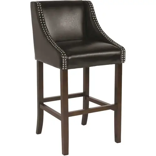 This classically sophisticated black barstool featuring soft and durable LeatherSoft upholstery with decorative nail trimming lends a touch of old world elegance and comfort. The solid wood frame and legs are streamlined with a touch of whimsy mimicking the curved design details of the arms. The deep seat is an invitation to lounge, relax and enjoy the atmosphere. Enjoy the comforts of this stool anywhere around the home with its full back. To ensure smooth gliding and floor protection, glides have been added.