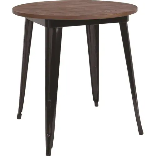 Welcome your customers in with style when you choose this square walnut standard height table with a metal frame. This sturdy table won't take up much floor space in your busy setting and provides your patrons with a cozy space to share food, drink, and conversation. Compact in design, the square tabletop has an appealing textured top. A cross-brace under the tabletop provides increased support and stability. Rubber floor glides protect your floor by sliding smoothly when you need to move it. Designed for both commercial and residential use, this trend-setting table is a great choice for coffee shops, bistros and your kitchen.