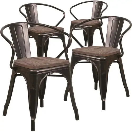 This rustic-chic, bistro stack chair will transform your dining room or restaurant space. Curved integrated arms allow you to rest easy. Chair is lightweight and easily stacks for storing. A cross brace underneath the seat adds extra stability and features plastic caps that prevent the finish from scratching when stacked. Move chairs around easily without scratching your floors with the protective floor glides. Designed for both commercial and residential use, you can liven up your kitchen, dining room or bistro with this modern-rustic style chair.