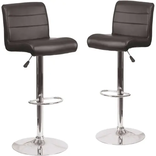 Come in and sit a while in this splendid black adjustable height barstool with exposed embellished stitching on the back. This stylish stool provides added comfort with the waterfall front seat, which is designed to remove pressure from the lower legs and improves circulation. The easy to clean vinyl upholstery is an added bonus when stool is used regularly. The height adjustable swivel seat adjusts from counter to bar height with the handle located below the seat. The chrome footrest supports your feet while also providing a contemporary chic design. To help protect your floors, the base features an embedded plastic ring.