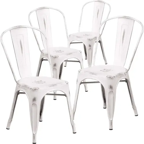 Spice up your kitchen or dining room by adding this colorful metal chair to your dining table. This metal dining chair pairs nicely with not only metal tables but also with glass and wood dining tables. Whether your home decor is shabby chic, traditional or industrially styled, you'll be surprised how easily this stackable metal chair will blend with your existing decor. Bistro chairs add a trendy old-world look to your restaurant and will add some color to your employee breakroom furniture. These cool colorful chairs can be enjoyed by everyone, high school and college students love to see trendy furniture used in their schools. The distressed metal chair features a curved back with a vertical slat along with a stabilizing cross brace. Your colorful dining chair will last longer thanks to the plastic bumper guards that protect the chairs' finish when stacked. While being used outside on the deck, pool or patio, you'll be delighted to find that these outdoor stacking chairs include drain holes to prevent pooling in the center of the seat. This translates to quicker seating turnaround times in your busy establishment. This trend-setting indoor outdoor dining chair will make a great addition to your kitchen, dining room or restaurant. Mix and match colors to make your dining room and outdoor living space pop with color. For longevity, care should be taken to protect from long periods of wet weather.
