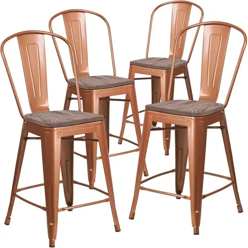 The high back, Bistro style counter stool will give your dining room or bar decor a refreshing rustic feel with its metal and wood features. This stylish metal stool features a curved back with a vertical slat and a cross brace under the seat for added support and stability. A wood seat adds comfort and beauty. The lower support brace doubles as a footrest, and the glides protect your floor by sliding smoothly when moving it. Designed for both commercial and residential use, this trend-setting setting counter height stool is a great choice for your restaurant's dining area or your home bar.