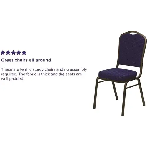Make an impressive presentation in your banquet hall when clients come to visit your facility with these ballroom chairs. Built for the commercial industry these popular crown back banquet chairs have been tested to hold up to 500 pounds. With a high seating capacity these stack chairs are perfect for the event rental business. This standout hospitality chair can be used as is and still command attention or be dressed up for formal events by placing a chair cover over it. The chair is cushioned with 2.5" thick CAL 117 fire retardant foam and is covered in durable upholstery for high usage. The sturdy frame with gracefully angled legs are made of 16 gauge steel in a lasting powder coated finish. Double support braces reinforce the frame to give it great strength and durability. Bumper guards prevent scratches on the frame when stacked (up to 15 high) and non-marring floor glides protect your floor by sliding smoothly when you need to move the chair. This multi-use stacking upholstered stack chair is an excellent option for churches, banquet halls, training rooms, hotels, convention centers and schools. Add banquet chairs to your home dining table to add a contrasting look to your dining room or kitchen.