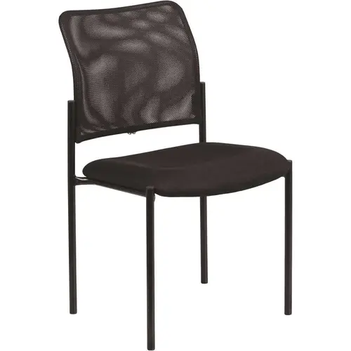 The sleek lines of this black mesh side chair add distinctive style and surprising comfort to your office, home or reception area. A flexible mesh back allows air to circulate, keeping you cool, while built-in lumbar support reinforces healthy posture, reducing back strain and muscle fatigue. The contoured seat cushion has a full 2.5 in. of padded foam, covered with black mesh upholstery. The steel tubular frame has a smooth black powder coat finish for easy maintenance. Plastic floor glides protect your floor by sliding smoothly, allowing you to easily rearrange the chairs, as often as you like. And these lightweight chairs can be stacked up to 5 in. H to transport and store. Line up some chairs for a uniform look in your training room, reception area or lobby or use one in your office as a guest chair.