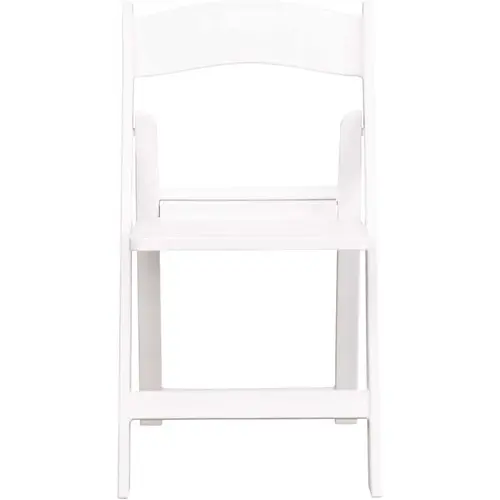 The White Resin Folding Chair combines comfort and elegance that looks good at all your special events, whether it's a backyard barbeque, a formal banquet or beach wedding. This chair is made from ultra-strong resin that's very lightweight, yet extremely strong and can hold up to 1000 pounds. The smooth frame is double braced for added stability and the front brace can be used as a footrest. The color of the frame is the same all the way through, so you don't have to worry about nicks and scratches. No re-painting or staining is ever needed; your chairs will look great for years to come. The easy to clean, durable design makes them the ideal choice for indoor and outdoor use. The chairs are portable and fold compactly to transport and store and feature a slatted seat that prevents water from pooling when it is used outdoors. Designed for residential and commercial use, these beautiful white resin folding chairs will make it an event to remember.