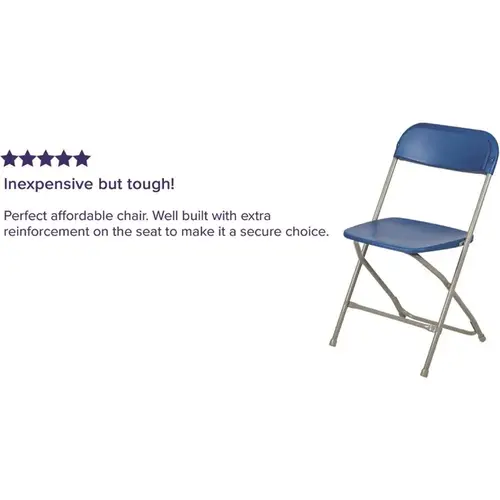 Celebrate the holidays and social gatherings without writing bring your own chair on the invite. The 650 lbs. Capacity Premium Plastic Folding Chair is a convenient option for weddings, school functions, barbecues, game night and catering events. This versatile compact chair is rated for commercial and residential use. When you need to furnish seating for a venue or keep seating on hand. The seat and back are textured and contoured for comfort. Drain holes in the seat keep water from pooling when the chairs get rained on. The 18-Gauge steel frame with leg strengthening double support rails gives this lightweight chair the strength to hold up to 650 lbs. Non-marring floor caps on the legs protect your floors from scuffs and scrapes by sliding smoothly when you move them. These portable chairs fold compactly for stackable storage or when needing to transport.