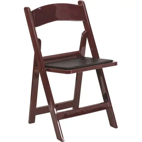 The Mahogany Resin Folding Chair combines comfort and elegance that looks good at all your special events, whether it's a backyard barbeque, a formal banquet or beach wedding. This chair is made from ultra-strong resin that's very lightweight, yet extremely strong and can hold up to 1000 pounds making this portable folding chair perfect for any social event, your home office or remote learning space. The smooth frame is double braced for added stability and the front brace can be used as a footrest. The color of the frame is the same all the way through, so you don't have to worry about nicks and scratches. No re-painting or staining is ever needed; your chairs will look great for years to come. The chair comes with a detachable, washable, waterproof seat cushion filled with fire retardant foam. The easy to clean, durable design of these chairs makes them the ideal choice for indoor and outdoor use. The chairs are portable and fold compactly to transport and store.