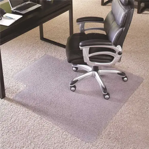 Move around easily in your carpeted workspace with this Big & Tall clear vinyl, commercial grade chair mat that will prevent carpet wear caused by chair casters. Rated to hold up to 400 lbs., this mat is ideal for shift work. It features a scuff and slip resistant top surface for durability and safety. The underside has a gripper back to firmly anchor the chair mat on medium to high pile carpet, protecting your carpet from spills and damage. The mat includes a protruding lip to protect the carpet under the desk and allow the chair to roll even when it's all the way under the desk. Manufactured to meet GREENGUARD Gold specifications for low chemical emissions, this mat is an ideal choice for carpeted areas.