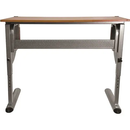 Whether you're a master builder or just like a workspace that is a little different, this Adjustable Drawing and Drafting Table is a space-saving workspace for creative work in your home, office, or at the job site. It features an attractive .75 inch thick cherry melamine laminate work surface with a raised metric ruler along the top and bottom edges for easy measurement. A curved tray holds building plans, artwork or supplies and a lower supply tray keeps your work area clear. The adjustable work surface raises for optimal positioning, from flat to a 40 degree angle, and locks in place. The pewter frame is height adjustable up to 47.75 inches, giving you the option to sit or stand while working. This drafting table offers a practical option for artists, architects and engineers who don't have a lot of dedicated space.