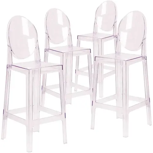 The transparent Bar Stool brings modern design, elegance and function to your home, restaurant and special events. This modern stool with its near invisibility highlights your artwork and other furniture, lightens a crowded space and can make a small room appear larger. The contoured, polycarbonate molded seat provides comfort. Protective floor glides protect your floor by sliding smoothly when you need to move these beautiful chairs. This beautiful chair will become your premier choice for both indoor and outdoor events. Coordinate your ghost chairs with ghost Bar Stools for an elegant and diverse appeal.