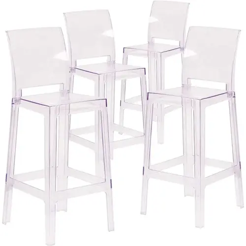 The transparent Bar Stool brings modern design, elegance and function to your home, restaurant and special events. This modern stool with its near invisibility highlights your artwork and other furniture, lightens a crowded space and can make a small room appear larger. The contoured, polycarbonate molded seat provides comfort. Protective floor glides protect your floor by sliding smoothly when you need to move these beautiful chairs. This beautiful chair will become your premier choice for both indoor and outdoor events. Coordinate your ghost chairs with ghost Bar Stools for an elegant and diverse appeal.