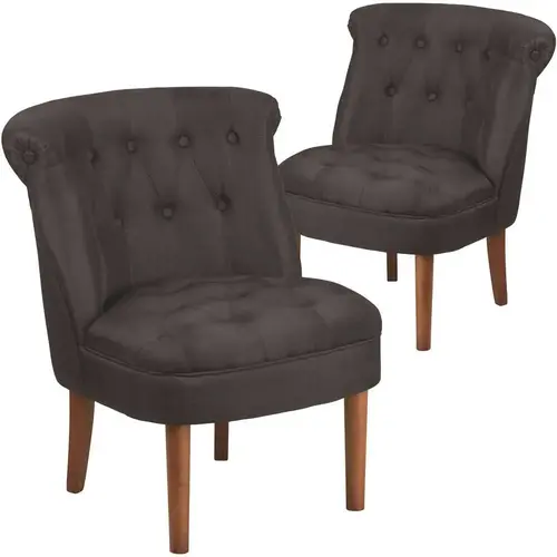 This small framed accent chair will provide a fresh and pleasing look to your space. Button tufted upholstery highlight this chair. This chair features a rounded seat and wood legs.