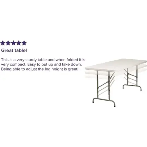 This rectangular folding table is 6 ft. long and is beneficial in a multitude of settings that include banquet halls, conference centers, cafeterias, schools and in the home. The table can be used as a temporary seating solution or be setup for everyday use. This table is also height adjustable to conform to a range of users. The durable blow molded top is low maintenance and cleans easily. The table legs fold under the table to make storage more convenient and for better portability. This table is commercial grade to withstand everyday use in the hospitality industry.