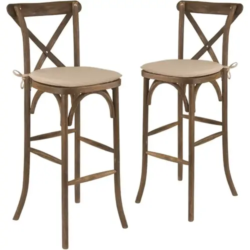 The Cross Back Bar Stool creates a charming and inviting ambiance with its curved lines and smooth finish. The designer cross back adds a modern, yet classic appeal to your dining room. The included cushion will keep you comfortable. Constructed of ash wood and a beautiful finish, this Bar Stool is very lightweight, yet extremely strong and wobble-free. These beautiful Bar Stools ship fully assembled, can hold up to 350 lbs. and can be stacked 4-high for storage. Designed for commercial and residential use, this durable and attractive bistro style stool is a great choice for your restaurant or dining room at home.