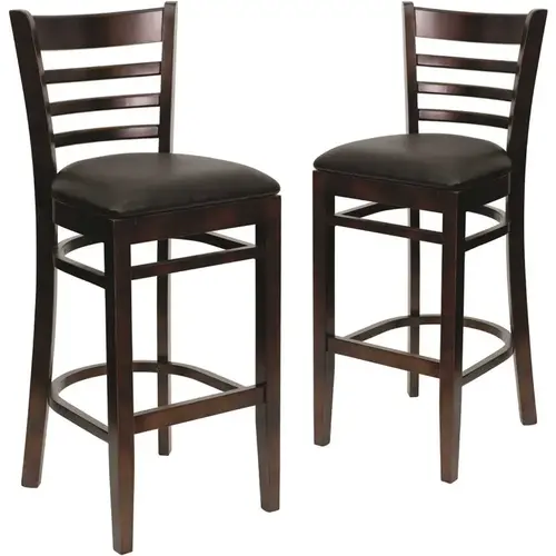 Create a first-rate dining experience by offering your patrons great food, service and attractive furnishings. This classic walnut wood bar stool will offer guests a warm, inviting look when entering your establishment. This chair will make an attractive addition to your restaurant, pool hall, lounge, bar or other high traffic venue. This stool is easy to clean, which is an important aspect when it comes to a business. This bar stool was designed to withstand the daily rigors in the hospitality industry, but will also provide a cozy, intimate quality to your home. The ladder back design and thickly padded, black vinyl upholstered seat will keep your guests comfortable. The durable frame is stabilized with mortise and tenon construction with metal wood screw reinforcements. Two curved support bars provide extra stability and include a footrest for improved posture. The floor glides help protect your floors and ensure smooth gliding. This charmingly styled chair is a must have, whether used in the home or your commercial business.