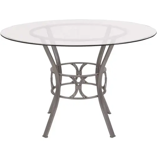 Building the perfect dining room is easier when you have a great foundation. Starting with an exquisite ornamental pedestal base this 45" glass topped dining table is off to a phenomenal start. Crowned by a round, thick glass top with beveled edges that shimmer in the light, this striking table will add an elegant aspect to your dining room or kitchen. On the practical side, floors are protected with floor glides in case of accidental movement or rearrangement. Gather family and friends to enjoy great meals around this dazzling table.