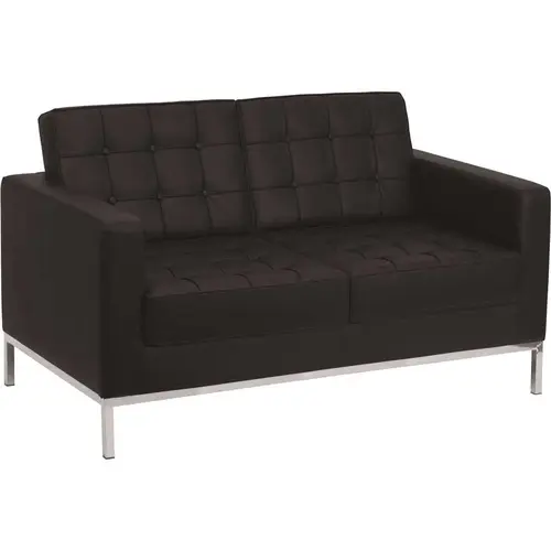 The black Leathersoft loveseat with stainless steel frame brings comfort and trend-setting style to your waiting room, reception area or home. It features a straight arm design with fixed, button-tufted seat and back cushions, which are filled with 5.5 in. of foam and upholstered in Leathersoft. A stainless steel frame and integrated legs give this loveseat added strength and a distinctive flair. Make a great impression on your clients and customers with this handsome contemporary loveseat, that will be sure to be a great addition to any establishment.