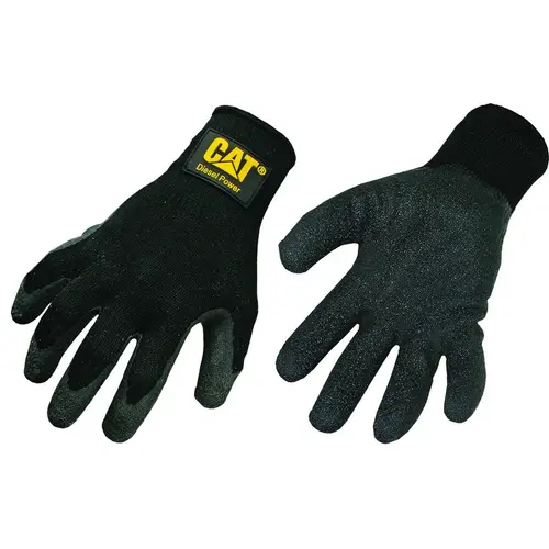 Poly cotton knit back with fully coated latex palm and fingers, knit wrist for snug fit. Cat diesel power rubber logo on wrist of each hand.