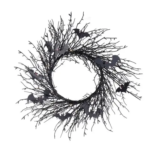 20 inch black Halloween twig wreath with black bats on it and 35 battery operated LED micro lights that color change from purple to warm white. Has 9 functions and takes 3AA batteries.