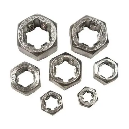 7 piece rethreading right hand, fractional, coarse thread hexagonal re-threading dies set. Set consists of 1/4", 5/16", 3/8", 7/16", 1/2", and 9/16" rethreading dies. For repairing damaged bolts or studs. Will not crosscut or undercut the thread the way a cutting die will. Do not use on hardened threads for to cut new threads. Made from high carbon alloy steel for a long tool life.