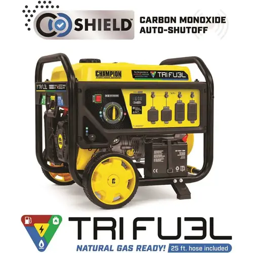 The Champion Power Equipment 100416 8000-Watt Tri-Fuel Portable Natural Gas Ready Generator with CO Shield is reliable, giving you the ability to operate your generator on 3 types of fuel. The EZ Start dial allows you to safely select gasoline, propane (LPG), or natural gas (NG) as your fuel source, and a propane/natural gas selector is located on the side. Using natural gas, the engine produces 8750 starting watts and 7000 running watts. A 6-foot propane hose with a built-in regulator is included, and a 25-foot NG hose kit. Using gasoline, the 459cc Champion engine will run for 12.5 hours at 50% load when the fuel tank is full. When using a 20-pound propane tank, it will run for 5 hours at 50% load. The covered outlets include a 120V 30A locking outlet (L5-30R), a 120/240V 30A locking outlet (L14-30R) and four 120V 20A GFCI protected household outlets (5-20R). CO Shield technology monitors the accumulation of carbon monoxide (CO), a poisonous gas produced by engine exhaust when the generator is running. If CO Shield detects unsafe elevated levels of CO gas, it automatically shuts off the engine. CO Shield is not a substitute for an indoor carbon monoxide alarm or for safe operation. DO NOT allow engine exhaust fumes to enter a confined area through windows, doors, vents or other openings. Generators must ALWAYS be used outdoors, far away from occupied buildings with engine exhaust pointed away from people and buildings. Meets the requirements of ANSI/PGMA G300-2018.