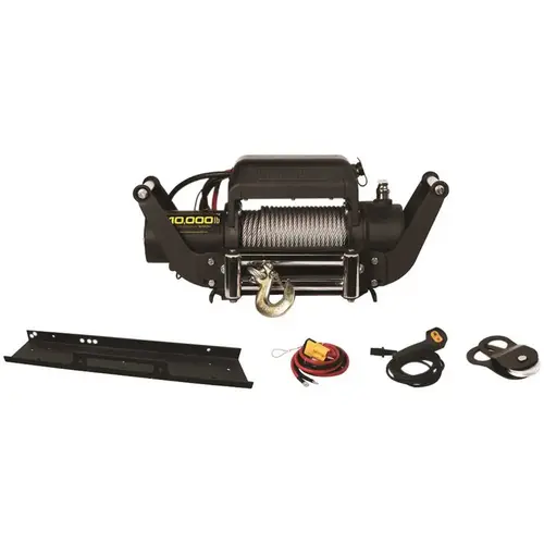 The Champion Power Equipment 11006 10,000 lbs. Truck/SUV Winch Kit with a 3.6 HP (12-Volt) DC series wound motor is designed for powerful and reliable winching with your truck or SUV. With a gear reduction ratio of 216:1, this winch boasts a line speed of 3.9 ft. per minute with a full load and 15.7 ft. per minute with no load. The 85 ft. by galvanized, super-duty aircraft cable is less prone to fraying. This incredibly strong cable is guided onto the 2.5 in. x 8.8 in. drum through the reliable roller fairlead to maximize the life of the cable. The efficient 3-stage planetary gear system, dynamic braking system and free spooling clutch along with the hand-held quick-connect remote control and 12 ft. cable offer excellent control while winching. With a rated line pull of 10,000 lbs., this winch installs quickly with our Speed Mount 2 in. hitch adapter, which features convenient 3-position adjustable handles that also serve as side guards to protect your winch. The Speed Mount hitch adapter is designed for quick and easy mounting, transportation and storage. To ensure you'll have everything you need to start winching, in addition to the Speed Mount hitch adapter, you'll also receive a roller fairlead, a hand-held quick-connect remote control, a snatch block and 6 ft. battery lead cables. Champion Support and our nationwide network of service centers will back up your purchase with a 2-year limited warranty and free lifetime technical support.