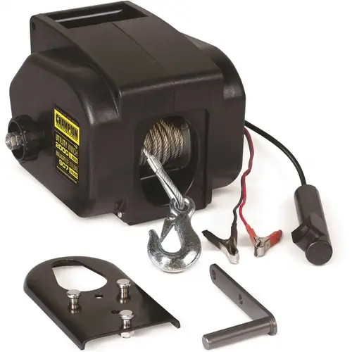 The Champion Power Equipment 12090 2000 lbs. Marine/Trailer Utility Winch Kit is designed for portable, reliable winching with your boat or trailer. Whether you need to load or unload your boat or ATV onto a trailer or if you're just looking for a portable solution to getting unstuck, this winch kit provides powerful performance along with all the accessories you need for an easy winching experience. Featuring a rated line pull of 2000 lbs., a marine rated line pull of 5000 lbs. and a rolling rated line pull of 6000 lbs., this versatile winch is powered by a 0.3 HP (12-Volt) DC motor. If you need the option of operating your winch manually, use the included hand crank. With a line speed of 1.7 ft. per minute with a full load and 4.5 ft. per minute with no load, this winch's 3-stage straight gear drive system is equipped to handle boats up to 18 ft. L. The included carry handle makes transporting this winch even more convenient. Connecting the winch to your vehicle is easy with the extended reach 20 ft. battery cables, plus use the handheld remote control switch to operate your winch from a safe distance of up to 10 ft. The durable 30 ft. x 1/5 in. galvanized, super-duty aircraft cable is less prone to fraying, even when used in highly abrasive terrain, such as in rocks, mud, or sand. Champion Support and our nationwide network of service centers will back up your purchase with a 2-year limited warranty and free lifetime technical support.