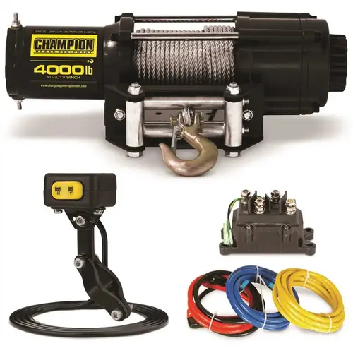 The Champion Power Equipment 14001 4000 lbs. ATV/UTV Winch Kit includes everything you need to start winching, including cables and contactor, a mounting channel, roller fairlead and a wiring kit with contactor and mini-rocker handlebar switch. This winch kit is the perfect combination of power and performance to use with your ATV, trailer, boat or snowmobile. With a rated line pull of 4000 lbs. mount this winch on your ATV or side by side with the mounting channel to quickly harness the strength of its 1.4 HP (12-Volt) DC permanent magnet motor. The 49 ft. x 7/32 in. galvanized, super-duty aircraft cable is less prone to fraying, even when used in highly abrasive terrain, such as in rocks, mud, or sand. This incredibly strong cable is guided onto the 1.7 x 3.2 in. drum through the reliable roller fairlead to maximize the life of the cable. The 3-stage planetary gear system along with the free-spooling clutch and ergonomic mini-rocker handlebar switch offer excellent control while winching. Designed with your safety in mind, this winch features dynamic braking of the winch drum so you'll have the stopping power you need for each job. With a gear reduction ratio of 180:1, the winch boasts a line speed of 3.3 ft. per minute with a full load, and 12.8 ft. per minute with no load. Champion Support and our nationwide network of service centers will back up your purchase with a 2-year limited warranty and free lifetime technical support.