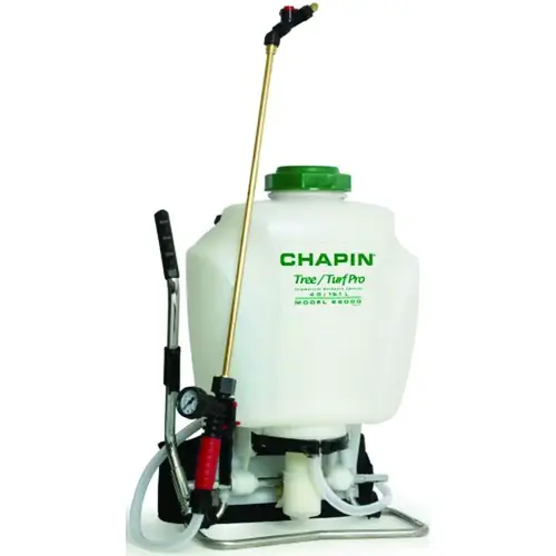 The CHAPIN Tree/Turf Pro sprayer is one of our top backpack pump sprayers for the professional landscaper as well as the homeowner. Featuring control flow technology that provides a continuous spray stream at 21 psi and more efficient use of chemicals, the sprayer comes with a 4 gal translucent poly tank with a 4 in wide mouth opening for easy filling and cleaning, poly shut-off, three nozzles for a variety of applications, three-stage filtration system to prevent clogging, brass wand and an innovative pump handle that can be set up for either right or left-hand use. The handle also folds up for compact storage. Padded shoulder straps offer lumbar support and a backpad for hours of comfortable spraying. Viton seals provide compatibility with fertilizers, weed killers and pesticides.