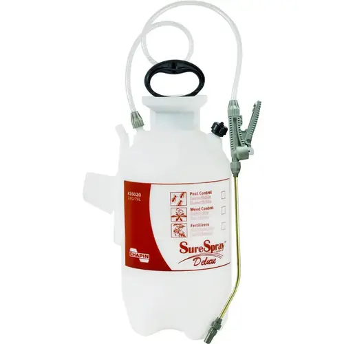 The CHAPIN SureSpray deluxe sprayer is ideal for the homeowner and the professional. The 2 gal translucent poly tank with clean'n easy design has a large funnel-top opening for no mess filling and cleaning, the unique SureSpray anti-clog filter for clog-free spraying, curved brass wand and poly nozzle.