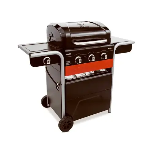 Char-Broil, Gas 2 Coal, Hybrid Grill, Main Burner 40,000 BTU, Side Burner 12,000 BTU, Total 52,000 BTU, Cook With Gas Or Charcoal, 3 Stainless Steel Burner With A 12,000 BTU Flush Lidded Side Burner, 420 SQIN Primary Cooking Space, Porcelain Coated Cast Iron Grates & 130 SQIN Porcelain Chrome Wire Swing A Way Warming Rack, Porcelain Coated Steel Lid & Fire Box, Two 7" Wheels Offer Easy Mobility, Electric Ignition System For Fast Reliable Start Ups For Gas & Charcoal, Lid Mounted Temperature Gauge, Charcoal Tray Storage Area, Assembled Dimension: 52.5"W x 24.6" x 47.5".