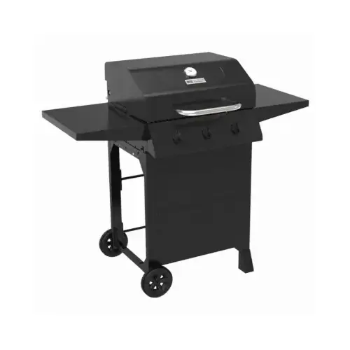 American Gourmet by Char-Broil 3-Burner black gas grill cart. Cooking area 360-square-inches of primary and 94-square-inches of secondary (warming rack). Steel side shelves with Gear Trax. Temperature gauge. Knob-integrated ignition. 6mm porcelain wire grates.