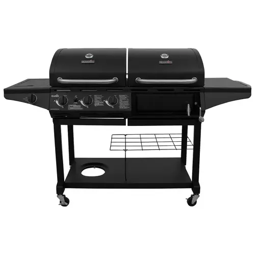 Char-Broil Charcoal and Gas Combo Grill, Primary Cooking Surface Area: 780 sq-in, Secondary Cooking Surface Area: 1010 sq-in, 30,000 BTU, 4-Burner, Grate Material: Iron, Ignition Type: Electronic, Steel, 66-3/4 in W x 24-1/4 in D x 48 in H Dimensions