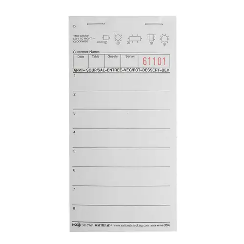 National Checking WaitRpad 3.5 Inch X 5.75 Inch 8 Line White 1 Part Guest Check 100 per Book 10 per Pack - 5 per Case