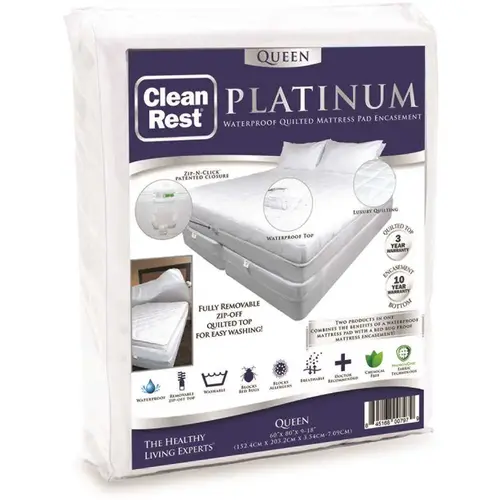 CleanBrands CLEAN REST Platinum Mattress Pad Encasement. Two products in one, CleanRest Platinum combines the bedbug protection of a zippered encasement with MicronOne fabric and the spoilage, wetness and stain protection of a waterproof quilted mattress pad. By combining two functions in one, it reduces the number of bedding layers you'll need. It's constructed with a 4-layer, cool, luxurious and durable micro-denier polyester top made from patented MicroLush top fabric. The top piece is fully removable. Just unzip the top portion when it's time to launder. This encasement's patented Zip-N-Click zipper closure mechanism helps to further safeguard from bedbugs at the zipper area. An ideal fit for Queen beds.