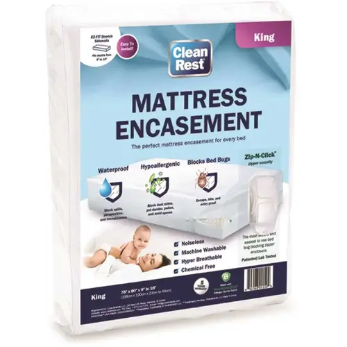 Cleanrest® Waterproof Mattress Encasement King, Patented Micronone Waterproof Fabric Passed The Cdc Test For Level 4 Virus Blocking Zip-N-Click, Our Patented Self-Locking Zipper Enclosure Will Snap Shut To Block Bed Bugs And Prevent Accidental Openings When Zip-Ties And Velcro Flaps Accomplish Neither Our Stretchy, Tear-Resistant Sidewalls Fit All Mattress Depths Like A Glove, Making It Easier For Housekeeping To Remove & Reinstall When Laundering Lab Testing Confirms 140% Better Sleep Surface Breathability Over Other Brands So Guests Can Sleep Dry & Cool Easy To Install 5-Year No-Rip Warranty Chemical Free, Free Of Vinyl, Phthalates And PVC Machine Washable Mfg #845168015509