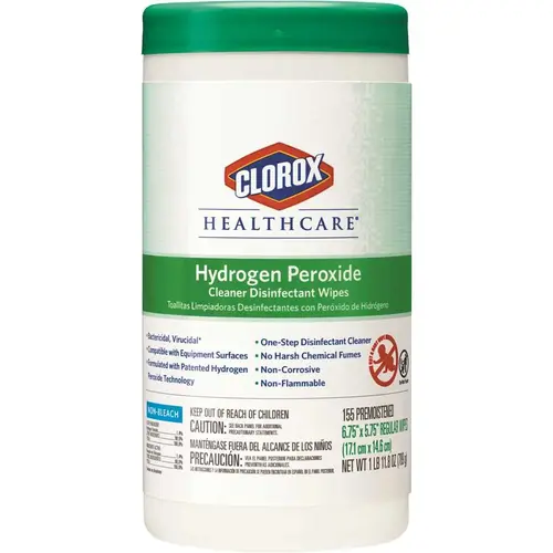 Clorox Healthcare Hydrogen Peroxide Cleaner Disinfectant Wipes kill microorganisms quickly on a broad range of surfaces. These strong and durable wipes are a 1-step solution to cleaning and disinfecting. They cover greater surface area with fewer wipes, for better value and less waste. They have 30 to 60 second hard surface disinfecting times on most bacteria and viruses. They also kill bacteria on soft surfaces in just 30 seconds. EPA-registered to kill pathogens on both hard and soft surfaces. Conscious of patient and staff comfort, these wipes are formulated with no harsh chemical odors, fumes or added fragrances. Available in small, medium and large wipe sizes to fit a variety of cleaning needs. Intended for use in commercial settings.