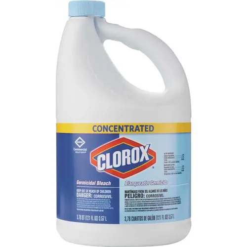 Show those germs who's boss with Clorox Germicidal CloroxPro Concentrated Bleach. Clorox Germicidal Bleach is EPA-registered to kill 39 organisms, including multiple strains of MRSA, norovirus, flu virus, E. Coli, listeria and Salmonella when used as directed on countertops, floors, toilets and more. This 121 oz. bottle of bleach makes 30 Gal. of germ busting cleaning solution to remove stains and kill mold and mildew. Clorox Germicidal Bleach also can be used in the laundry room to make whites whiter. Clorox Germicidal Bleach removes the toughest laundry stains from white clothes including red wine, grass, dirt and blood stains. It is safe to use in standard and high-efficiency washing machines. Ideal for use in busy healthcare environments, offices, schools and other commercial facilities. CloroxPro, where clean means everything. Packaging may vary