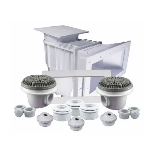 (1) Complete ABS Standard Skimmer (Clear Gaskets, 2 Inch Socket, 1.5 Inch Socket Reducers), (1) Square Faceplate Cover, (1) Extension Collar, (2) Galaxy Main Drains (Body, Lid, Ring, Bushings, Plug), Eyeball Fittings (1.5 Inch MIP with Flange), Inlet/Outl