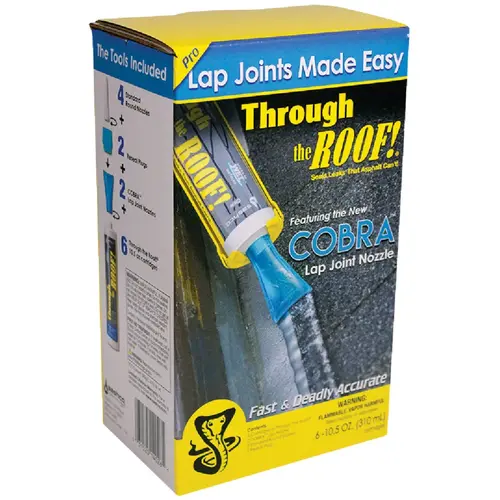 Cobra Lap Joint Nozzle extrudes a wide bead to easily cover all kinds of lap joints; roof flashing and window fins, and sandwich joints like thresholds. The Cobra's arched profile delivers a bead thicker in the middle and thinner on the edge. Places the mass of material where you need it, exactly over the lap joint itself. Through the Roof! is the clear, ultra-elastic sealant made to permanently stop and prevent roof leaks. It effectively seals around a variety of roof fixtures without the messy look of asphalt. Plus, Through the Roof! won't dry hard and crack like traditional asphalt repair products, and lasts 20 times longer. It expands and contracts with temperature changes, leaving you with a repair that sticks but won't stick out. Conforms to ASTM (American Society for Testing and Materials) C794. Sticks to surfaces wet or dry, in temperatures down to 0 F and up to 120 F (degrees Fahrenheit). Tenacious adhesion to a wide variety of roofing materials and won't discolor them. Goes on crystal clear and stays clear. Through the Roof! won't freeze. Adheres to most building materials; Metals - Aluminum, brass, steel, copper, and silver; Plastics - ABS, vinyl, Lexan, Polycarbonate, PVC, fiberglass, nylon, acrylic sheet/plexiglass; Other surfaces - Asphalt, brick, ceramic tile, concrete, stone, mortar, Stucco, Polyurethane, glass, terra cotta, cement, wood, cloth/canvas, Polyisobutylene, EPDM (Ethylene Propylene Diene Monomer) rubber. Completely paintable after 24 hours. Excellent UV (ultraviolet) resistance. Kit includes: (6) 10.5 Oz. cartridges of Through The Roof!, (2) 1-1/4 In. W. x 1/8 In. H. Cobra Lap Joint Nozzles, (4) standard round nozzles, and (2) reseal plugs.